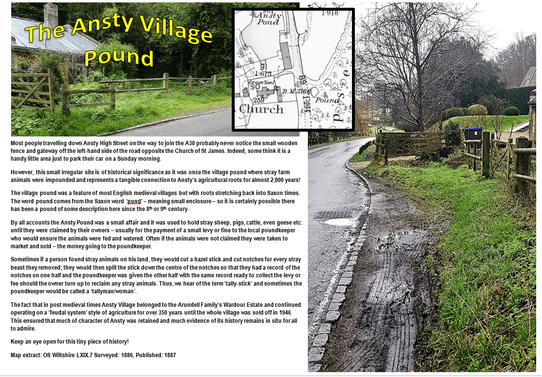 Here is a website for anybody who has a connection with Ansty past or present and its local hinterland. All the things on this website were painstakingly collected by a Jan Oliver for the Wiltshire Online Parish Clerk (OPC) Project and the Ansty section allows us a fascinating window into Ansty Village life when it was a truly rural settlement owned lock stock and barrel by the Arundell family of the nearby Wardour Estate. So click on the link and step into an age long gone yet not so far away.