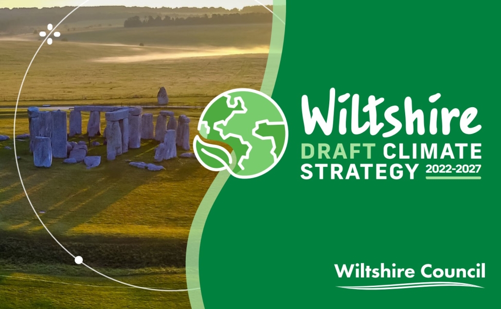 Stonehenge on a grassy plain with text: Wiltshire Draft Climate Strategy 2022-2027, Wiltshire Council.